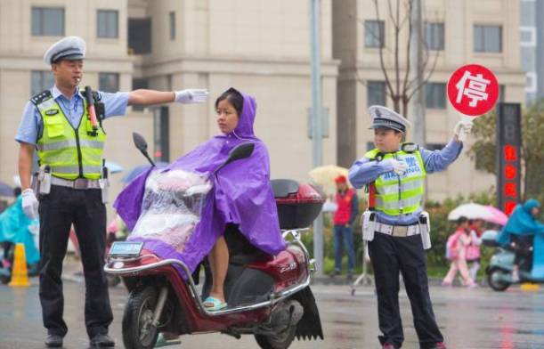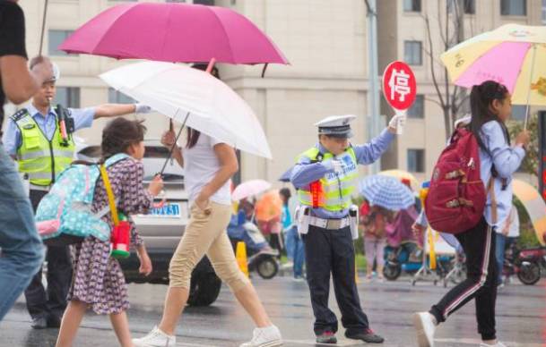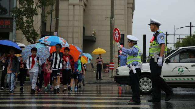 9月28日早上7时,下着蒙蒙小雨,杭州富阳区金浦路文豪路口,8岁小交警圆圆(化名)和富阳交警大队城区中队民警张灵敏一起,认真指挥交通,护送孩子们上学。