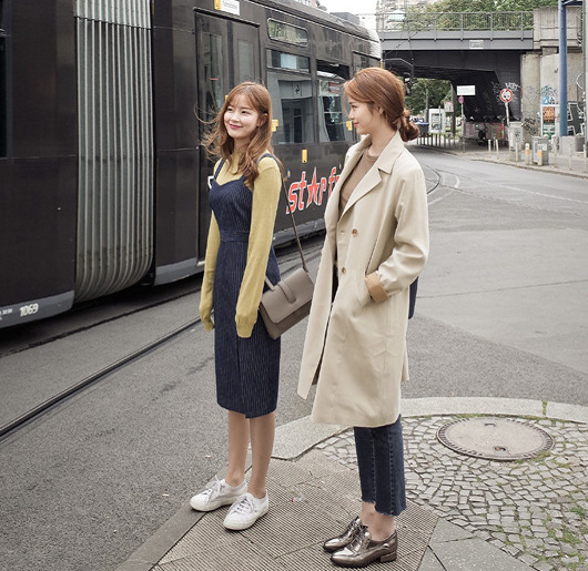 背带裙搭配长袖T十分俏皮可人,卡其色风衣搭配七分毛边牛仔裤文静又chic。