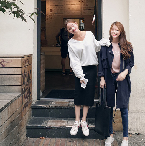 V领卫衣搭配迷笛裙,时髦又优雅,或者卫衣搭配牛仔裤风衣更添帅气。