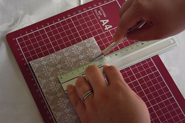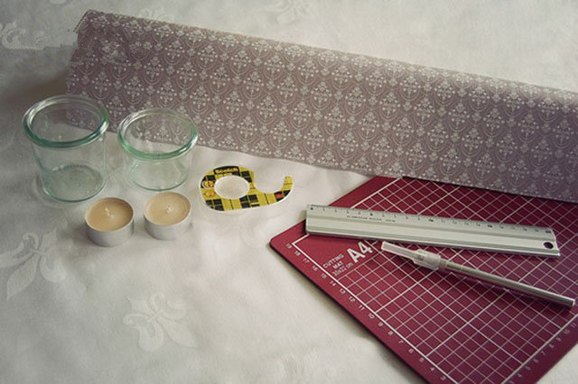 准备好所需材料,小玻璃杯,胶带,蜡烛,彩色卡纸,刻刀;将彩色卡纸裁成长方形后对折,在封口的一边用刻刀划成条,呈流苏状,注意划线的时候不要完全切断