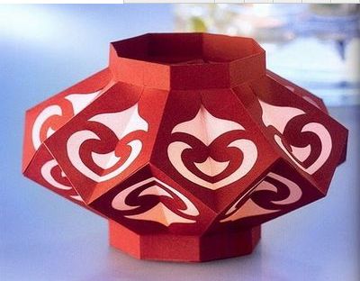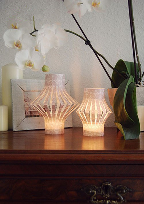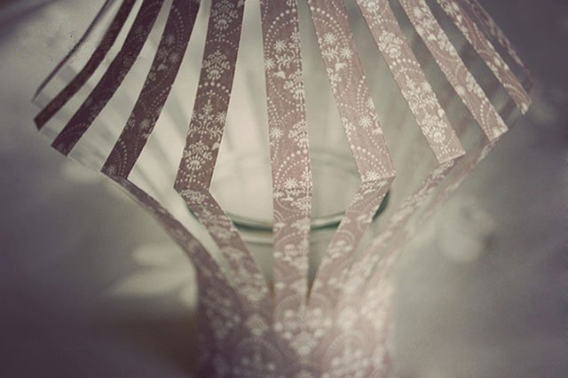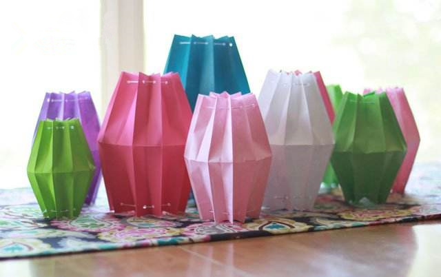将彩纸展开后卷成筒固定住,立起来之后自然呈现灯笼的形状,将其罩在小玻璃瓶上,在瓶子里面装上一个小蜡烛,点上火就完成啦~如果想要安全一点,在里面放一个小灯泡也是可以的哦!