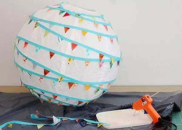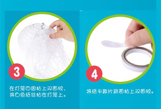 取出白纸(建议使用柔软的纸张),将白纸揉的软一些,然后用剪刀将纸张剪成一条一条的白丝,越细越好,并将白丝固定在灯笼上(从灯笼上面的边缘处粘贴)