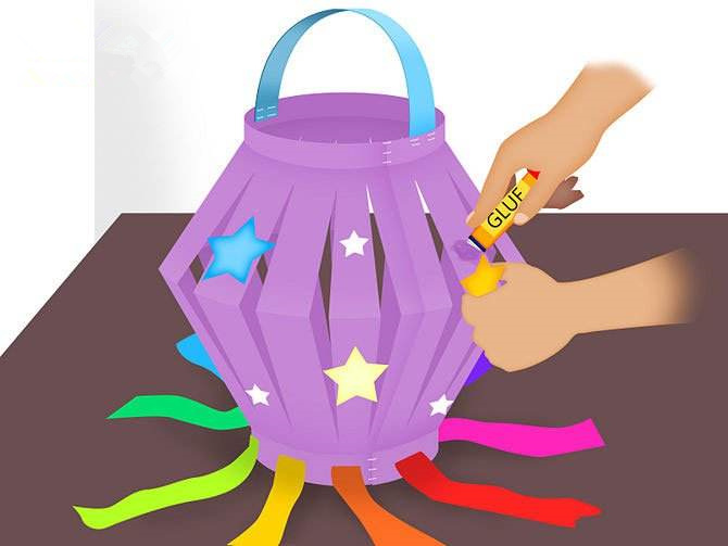 将小灯装在灯笼里(安全起见,这里不建议使用蜡烛哦,纸张易燃),在灯笼的两边内测粘上双面胶,牵一根毛线或者普通棉线,小灯笼就可以提起来了,最后拿一根管子或者小筷子跟绳子粘好,灯笼杆就做好了!