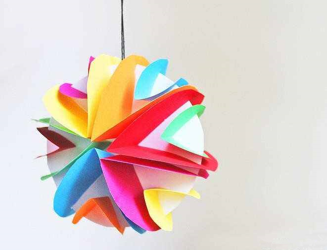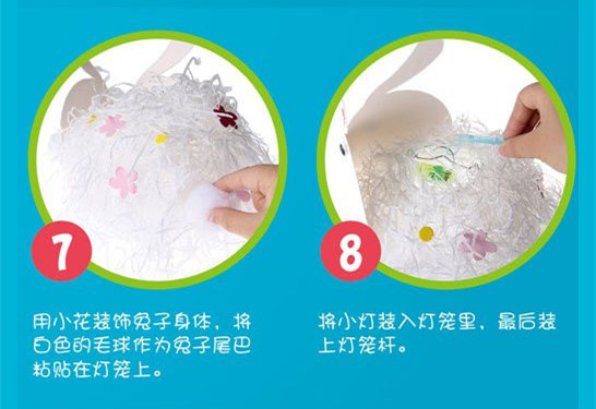 用彩纸剪一些自己喜欢的形状来装饰小兔子的身体,形状不要太大,颜色可以多一点,这样小兔子会更加缤纷漂亮!将多余的白丝揉成团粘贴在灯笼的后面,小兔子的尾巴完成!