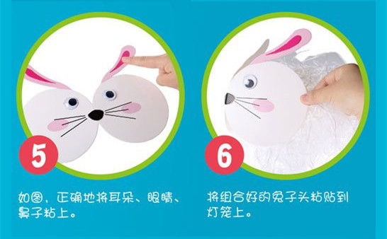 将做好的兔子的头粘贴在灯笼上,注意粘贴的位置,不要让小兔子的头太低了,应粘贴在灯笼靠上的位置,如图所示