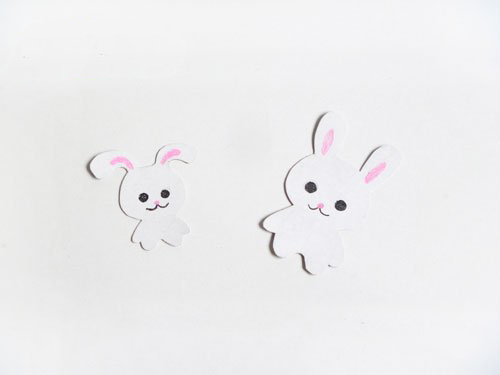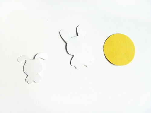 选择一张白色和黄色卡纸,在白色卡纸上画出自己喜欢的兔子图案,最好一大一小,在黄色卡纸上画出一个圆形,然后将它们剪下来,放在一边备用。