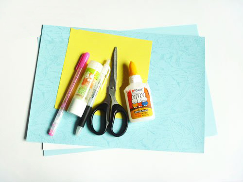 材料:彩纸,剪刀,胶棒,卡纸,笔