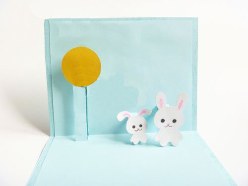在桌面上垫一块纸板,然后用小刀把窗户裁开,此时可以借助尺子哦!再在一张纸上画出一只嫦娥姐姐的小兔子,小兔子可是有一双红眼睛的哦!在左右两侧画出长条,用虚线表示要折的地方。