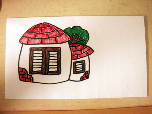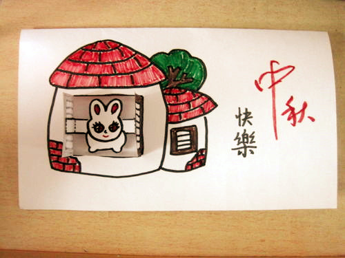 首先要先把纸卡对折,然后在上面画一个小屋子,在屋子上面画一个大大的窗户,因为过一会会做一个开窗的效果哦!在屋子的右边,可以写上中秋快乐,或者一些中秋节的祝福语,中秋节诗词等。