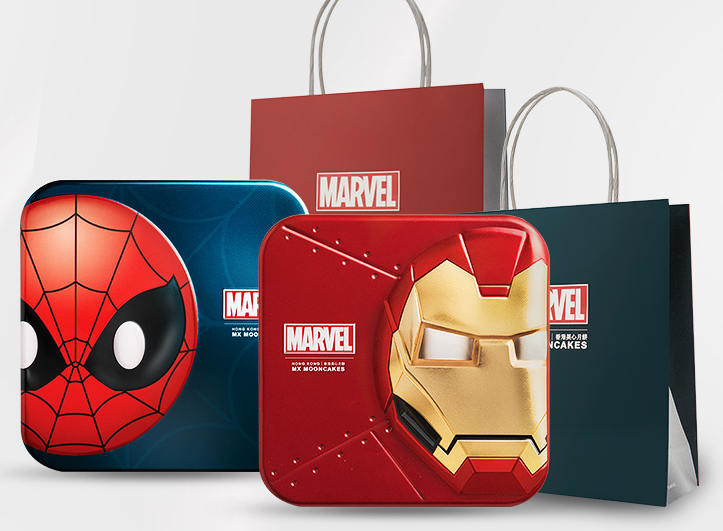 美心跟漫威合作,推出了钢铁侠绿茶红豆月饼和蜘蛛侠奶黄月饼的组合套装。