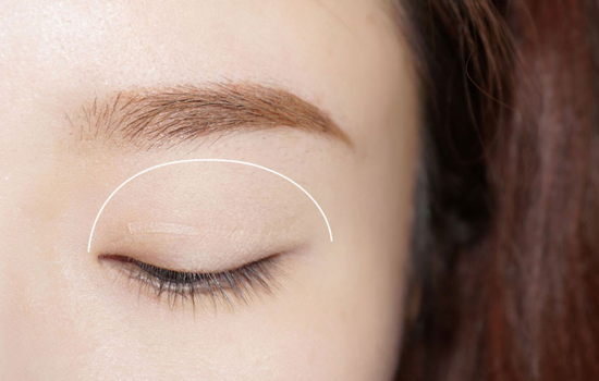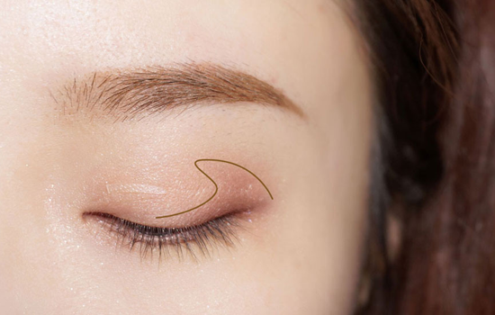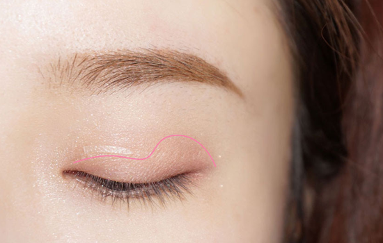 扁型刷沾取浅粉色眼影,从眼尾到眼头的位置,刷在眼皮上,眼尾的范围要大一些。具体位置如图所示。