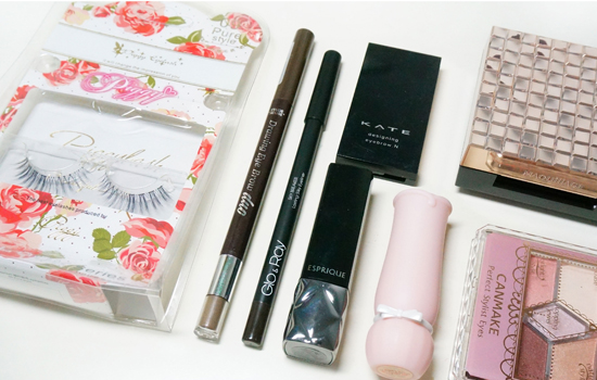 Covermarl中草药粉霜BO00、NARS裸光蜜粉饼、伊蒂之屋双头眉笔#01、KATE三色眉粉、canmake五色眼影盘#05、glo&ray眼线胶笔棕色、piggy假睫毛#09、资生堂心机腮红PK200、ESPRIQUE口红BE852、伊蒂之屋芭蕾系列口红PK023.