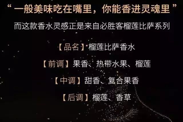 最近,必胜客和气味图书馆合作推出了一款榴莲味儿香水。目前已在天猫旗舰店上线,全球限量2000瓶,购买香水还会赠送5张榴莲多多比萨免费果肉增量券。
