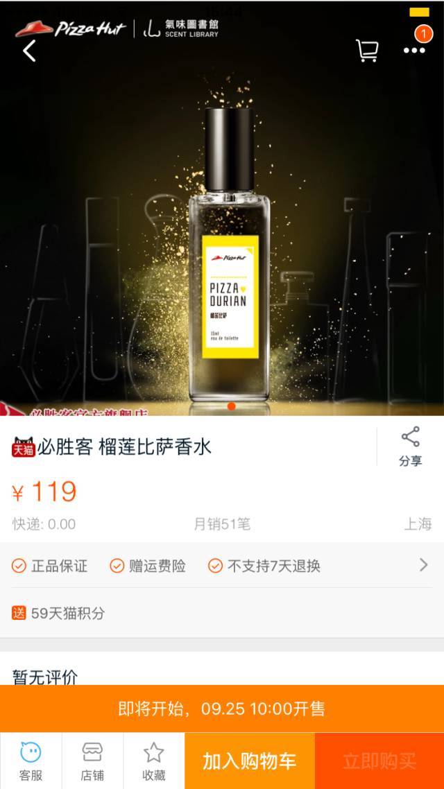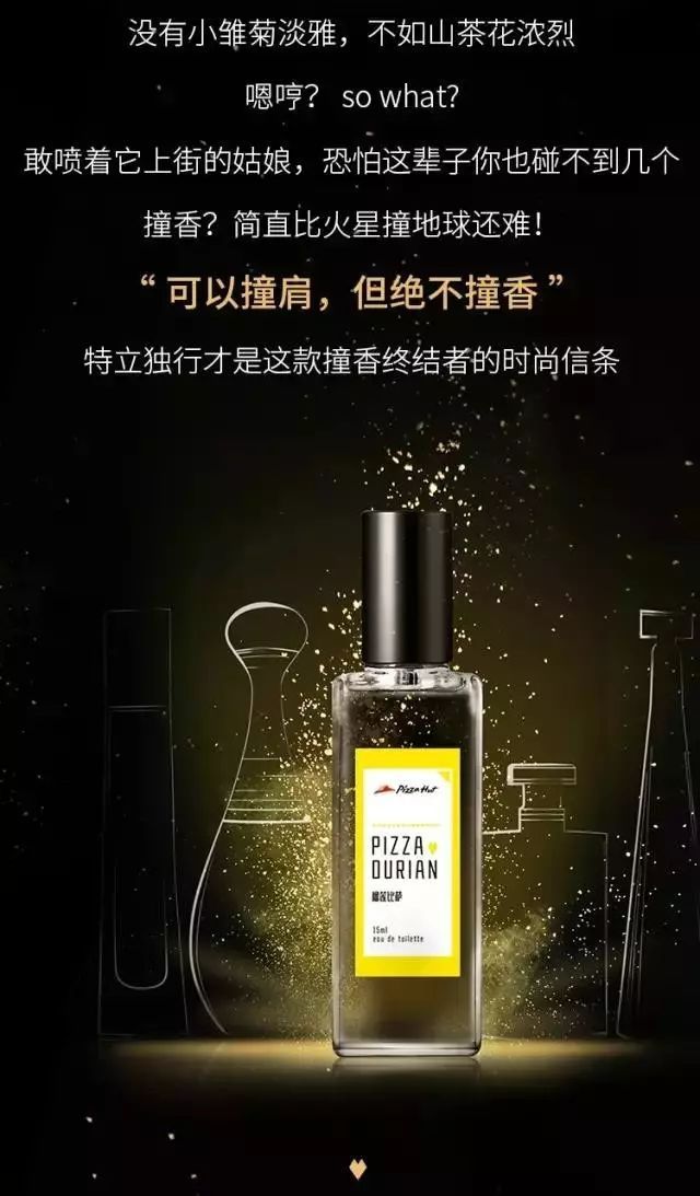 据悉,这款香水是为必胜客在同一天推出的新品“猫山王榴莲比萨”而特意打造的,价格为119元15ml。