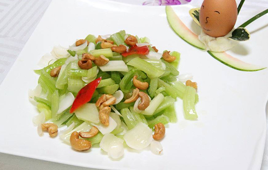 材料:百合50克,西芹100克,胡萝卜50克,腰果50克,盐1/4小匙,砂糖1/2小匙(糖不可少)。