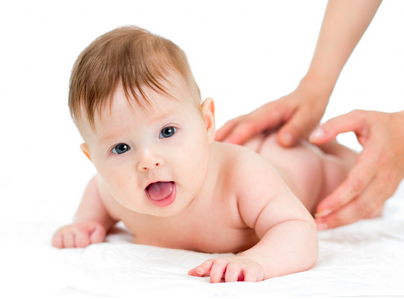 ❹用无刺激的婴儿专用洗发露给宝宝洗头,洗头时不要用力揉搓头发,防止打结,在除囟门的其他位置,用指肚给宝宝按摩头部促进血液循环和头发生长。