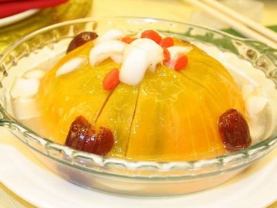 4.把红枣、百合装进南瓜碗里面。